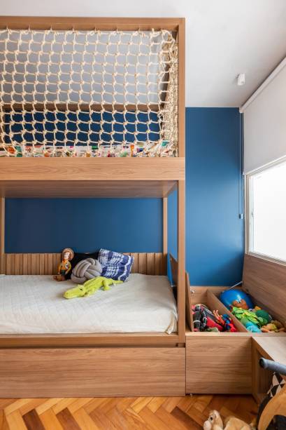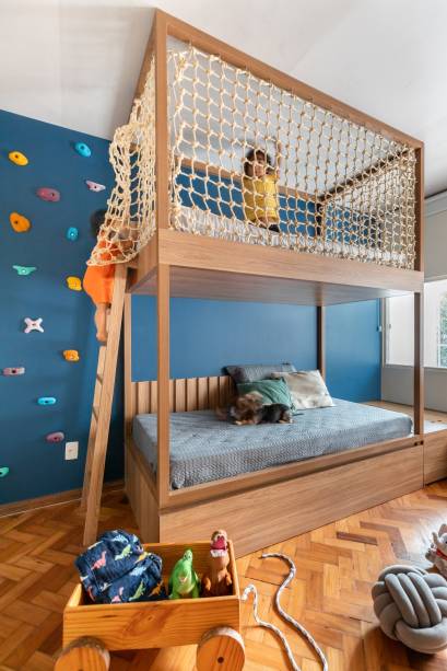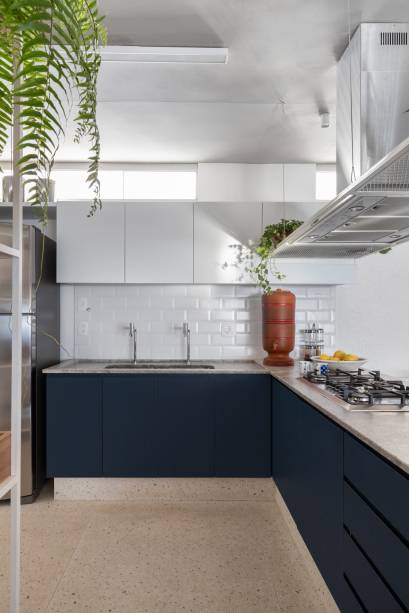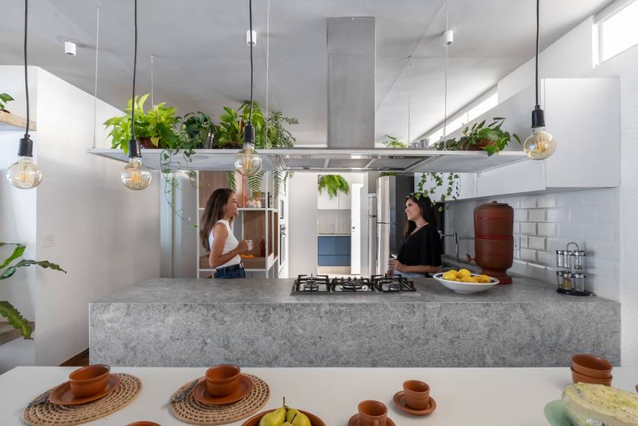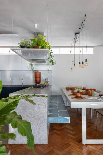 Na cozinha, as arquitetas desenharam uma bancada de granito em L, que possibilita a comunicação entre os ambientes e facilita o dia a dia da família. “A ilha com cooktop sustenta o banco suspenso revestido de ladrilho hidráulico azul, que serve como assento para a mesa de jantar”, conta Marianna. Detalhe: há espaço para a até 12 pessoas. Já a lavanderia foi transferida para onde, antes, existia um quarto e, assim, possibilitou o aumento da cozinha.