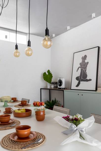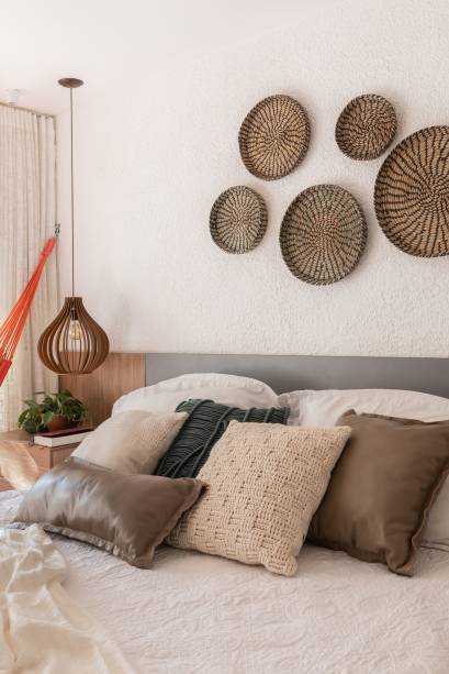 As raízes nordestinas dos moradores também foram levadas em consideração na hora de elaborar o projeto. As arquitetas usaram os revestimentos, objetos de decoração e mobiliário para criar relações entre o centro-oeste e o nordeste. “Priorizamos materiais que remetiam ao artesanato e natureza, criando uma atmosfera aconchegante”, diz Gabriella.