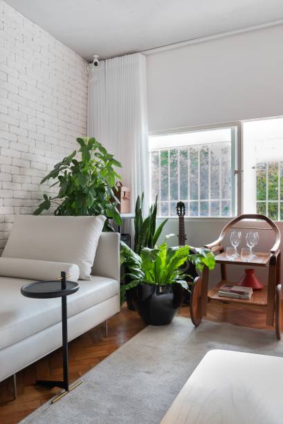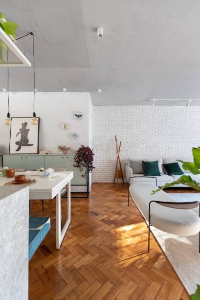 Em Brasília, um apê charmoso com piso de taco e parede de tijolinho