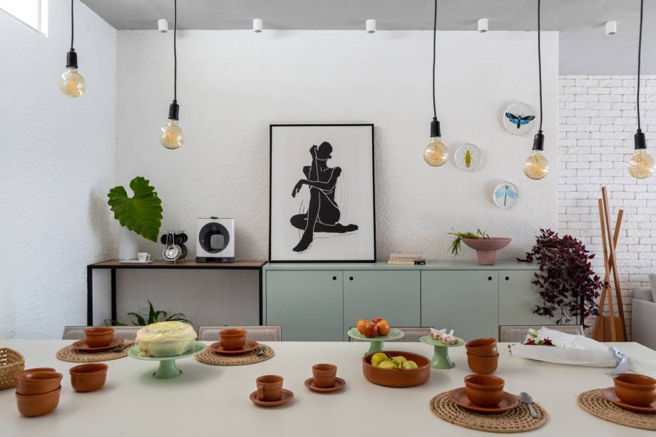 Em épocas normais (sem ser em uma pandemia), os moradores costumam receber visitas com frequência. Por isso, precisavam de uma grande área social, com espaço para família e amigos. Assim, o principal ponto do projeto foi integrar a sala de estar com a sala de jantar e a cozinha. “Demolimos a parede que fazia o fechamento e transformamos tudo em uma só área”, explica Gabriella.