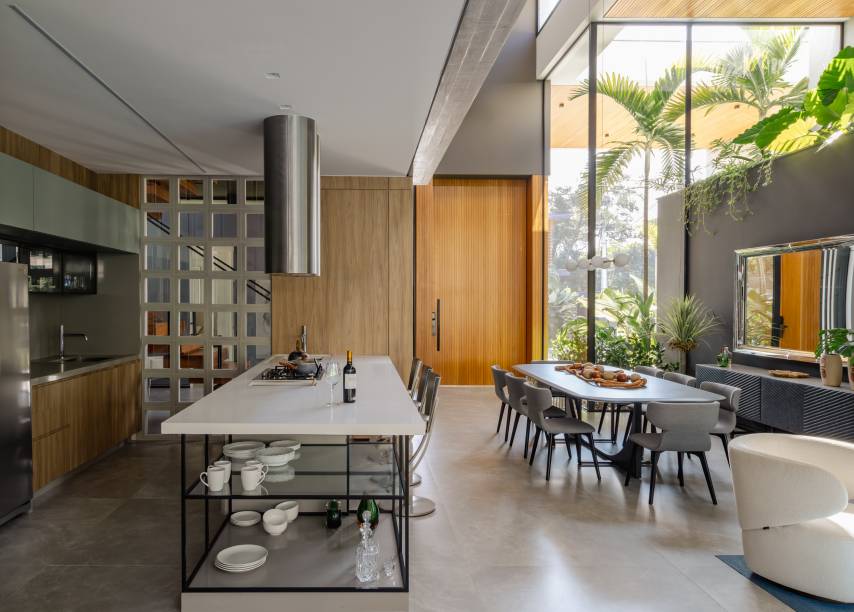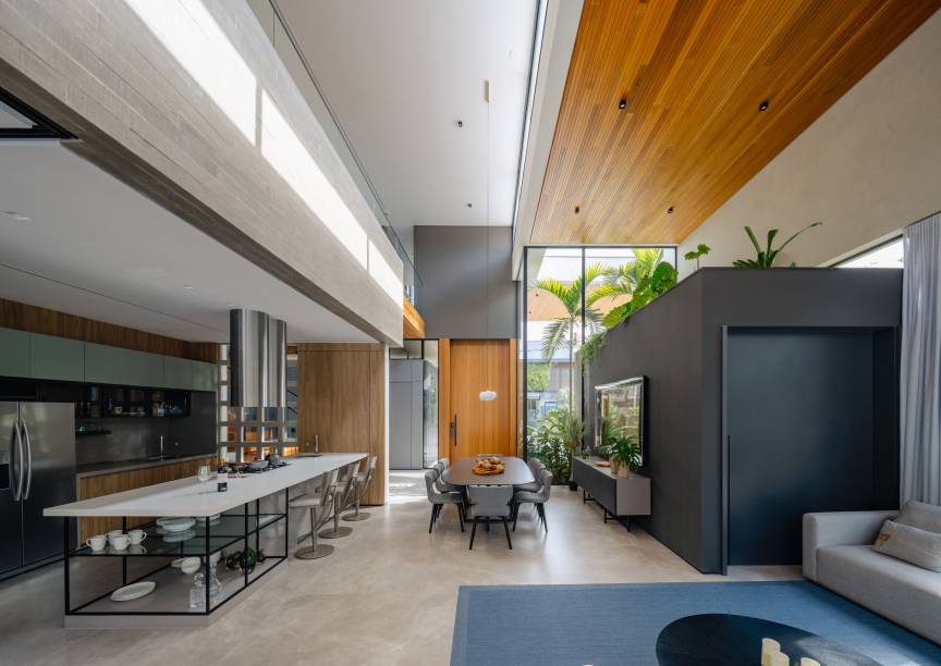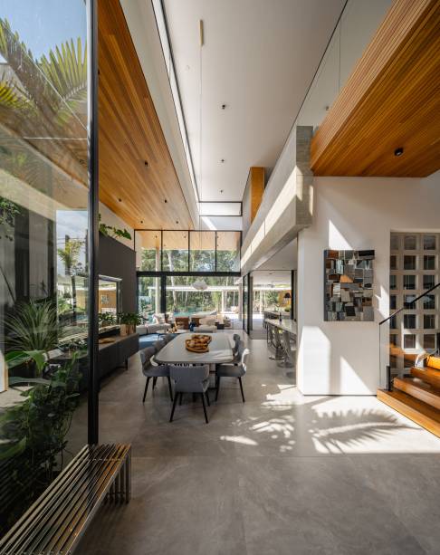 A área social é ampla e fluida, com uma planta livre que integra sala de estar, cozinha, sala de jantar e lazer, favorecendo a interação e a circulação. A sala de estar é cercada quase inteiramente por vidro, criando um diálogo constante entre o interior e o paisagismo externo.