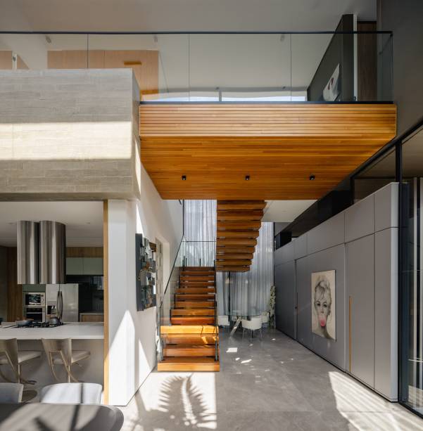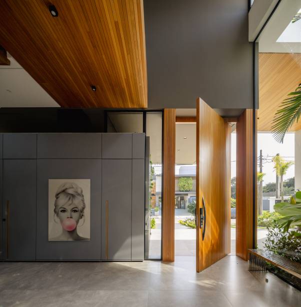 Um rasgo na laje, entre a garagem e a sala, permite a entrada de luz natural em um jardim integrado ao interior. Essa laje, com forro em madeira Tauari, se estende até os fundos da casa. A varanda, fechada por amplas esquadrias, oferece uma vista espetacular da Mata Atlântica ao fundo e uma integração perfeita com o paisagismo exuberante das laterais.