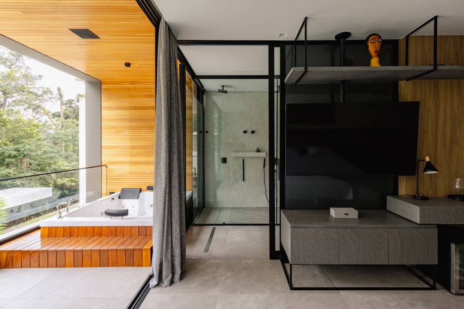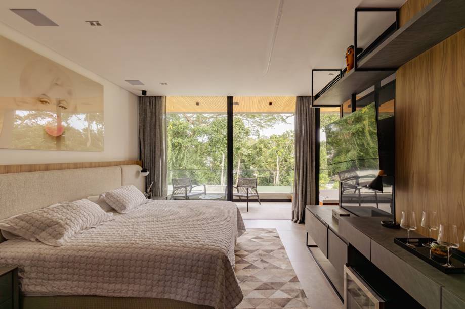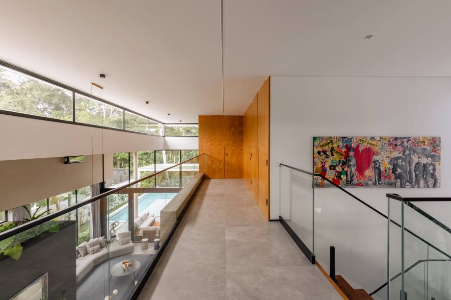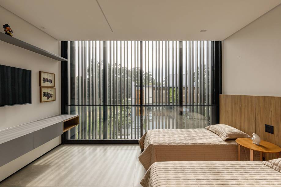 As suítes, na parte superior, criam uma ala mais isolada da casa, proporcionando tranquilidade e privacidade. Quase todos os dormitórios possuem janelas voltadas para áreas verdes. A suíte master foi posicionada ao fundo, com um majestoso caixilho que se estende entre as duas extremidades, integrando o dormitório ao banheiro.