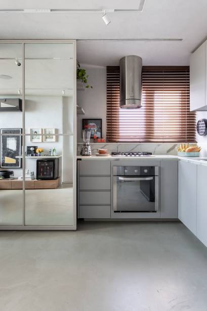 O andar térreo é praticamente todo integrado. Ali, piso e teto são de cimento queimado. A cozinha conta com uma bancada em L que se estende até a mini área de serviço que fica escondida atrás de uma porta de correr espelhada.
