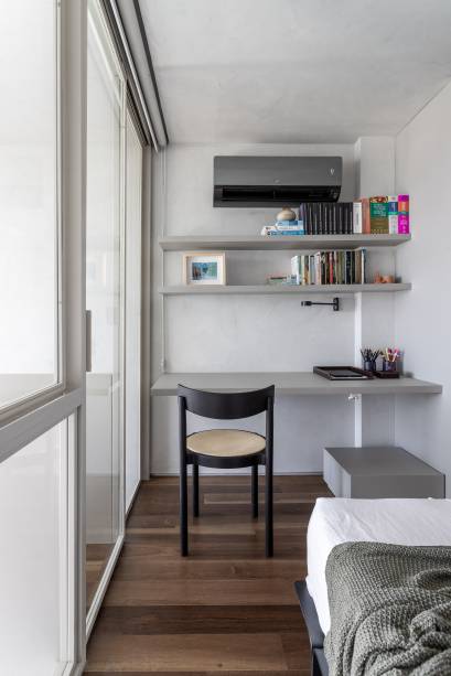 A parte íntima segue a identidade visual da área social, com paredes e teto em cimento queimado. O piso é de madeira e se estende até o banheiro, só se interrompendo na área do box. A suíte recebeu armários espelhados e um pequeno home office.