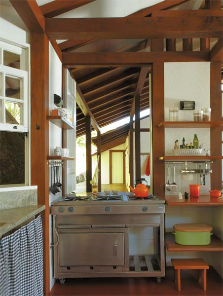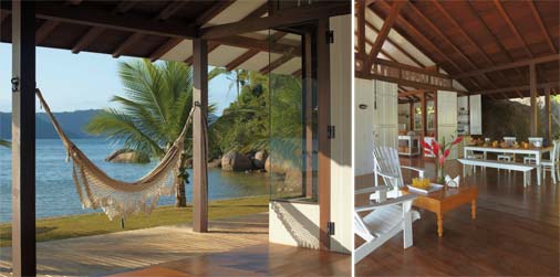 Ao ser arrematado, o terreno já abrigava duas construções caiçaras. Por respeito ao local, decidimos mantê-lo do jeito que encontramos, conta a proprietária. Assim, a casa maior passou a servir de abrigo improvisado para a família. Mas, com o tempo, a falta de conforto começou a incomodar e o casal convocou a arquiteta Íris Carneiro, que derrubou as duas construções e aproveitou a implantação para erguer apenas uma. Para chegar a esse resultado, a obra demandou organização e estratégia. O terreno está situado num lugar recôndito, cujo acesso é feito apenas pelo mar. Assim, o material primeiro vencia de caminhão a estrada de terra até uma praia próxima, onde era carregado no braço dos operários para o barco. Só então chegava à obra. Racionalizamos ao máximo a escolha dos materiais, conta a arquiteta. Utilizamos madeira, que é fácil de transportar, e blocos de concreto celular para vedar as paredes, pois dispensam o uso da areia.