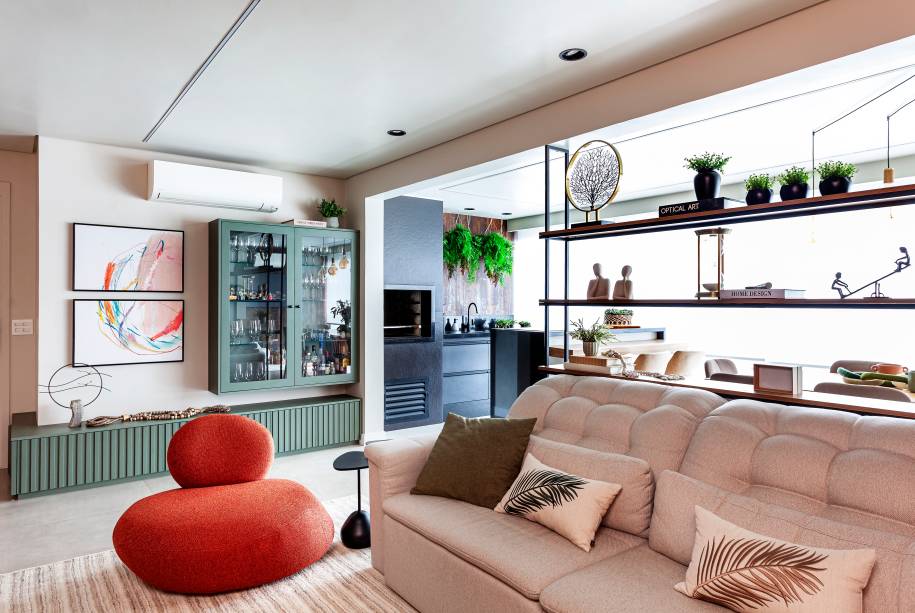 Estante sob medida emoldura sofá neste apê com varanda gourmet rústica