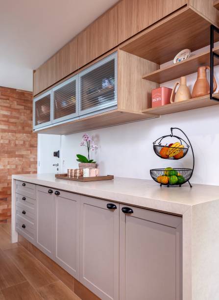 Assim, armários com portas ‘almofadadas’ e puxador concha e vidro canelado foram algumas das ideias apresentadas pela arquiteta. “O piso era cinza e completamente fora de contexto”, conta Cristiane. Para harmonizar com os tijolinhos, ela levou este elemento para a parede oposta e substituiu o piso por porcelanato com efeito amadeirado.