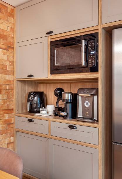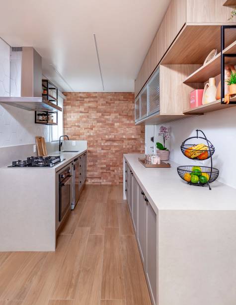 Para compor a cozinha, a profissional articulou as escolhas com um elemento já existente: o tijolinho aparente que figurava em uma das paredes. Para resolver a dissonância que o revestimento causava, o projeto se ateve a realizar escolhas com nuances semelhantes.