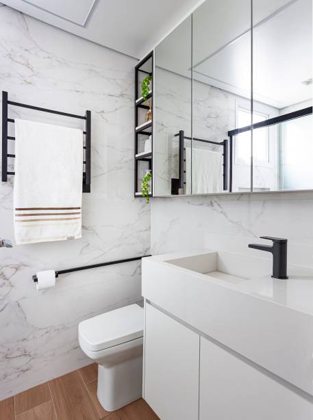 A arquiteta Cristiane Schiavoni optou por um porcelanato marmorizado no lavabo e banheiro master para um visual luxuoso.