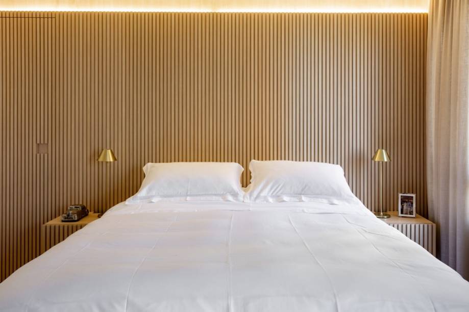 No quarto do casal, destaca-se a cabeceira ripada, que esconde a porta do maior closet. A atmosfera suave do ambiente foi completada com cortinas de tecido leve e o móvel da Entreposto.