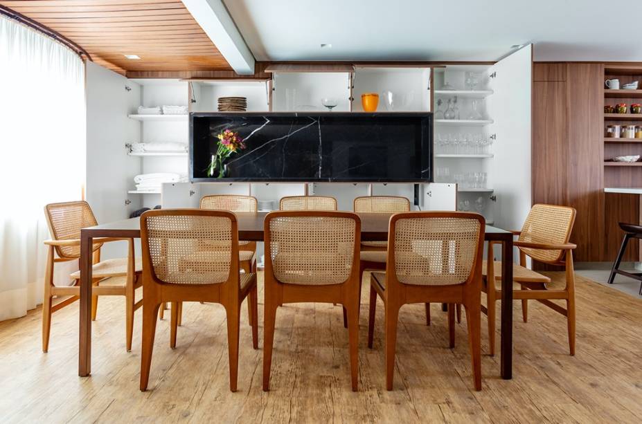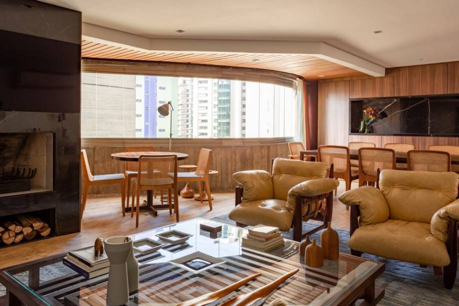 A decoração mescla o estilo contemporâneo e o clássico, com muita madeira e couro, que trazem sensação de aconchego. O ponto de partida do projeto foram as poltronas Moles, de Sergio Rodrigues, que já pertenciam ao morador. A partir daí, as profissionais pensaram em qual tipo de madeira se encaixaria melhor para compor o restante dos ambientes.