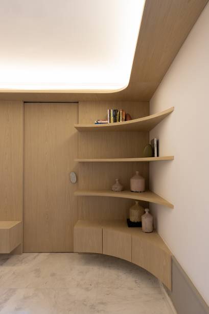 O reaproveitamento foi uma escolha consciente, pois já havia no apartamento o piso em mármore, bons armários na área íntima e até alguns móveis existentes.