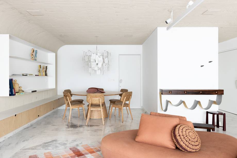 O apartamento conta com peças de mobiliário assinado como o Sofá Pedras, da designer Roberta Banqueri, elemento responsável pelo fluxo criado para a sala, além de muitas outras peças que traduzem os desejos e necessidades dos clientes.