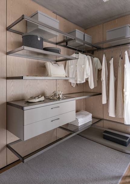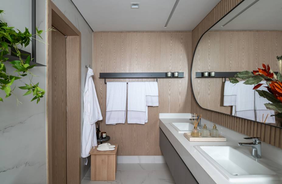 Já a suíte master traz uma paleta de cores serenas, com o uso de madeira clara e concreto para adicionar textura. A combinação desses materiais cria um equilíbrio entre o aconchego e a sofisticação.