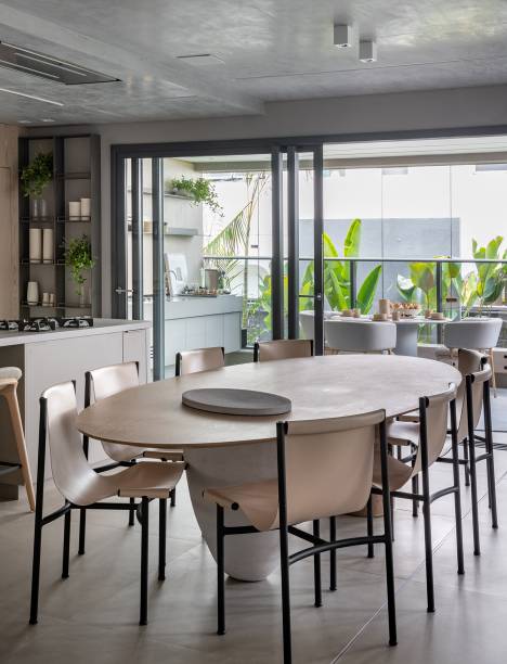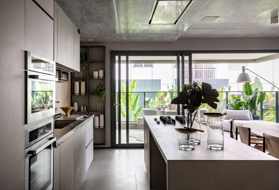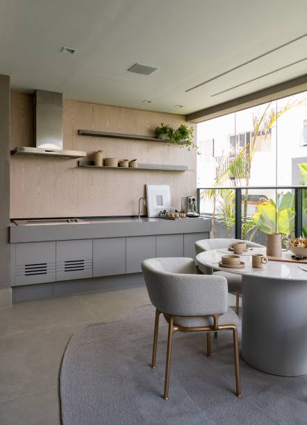 A integração entre a área de estar e a cozinha é o destaque do apartamento, solução que incentiva a convivência e celebração. “A ausência de barreiras é uma excelente escolha para famílias, pois permite que todos permaneçam conectados, independentemente de onde estejam na área comum”, explica o escritório.