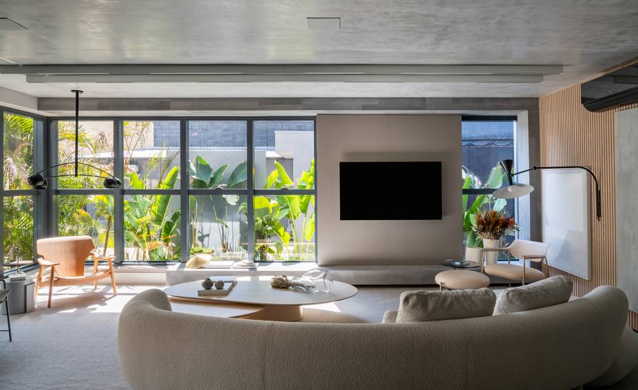 A ampla esquadria em L no living permite a entrada de luz natural e a combinação do sofá curvo com a mesa oval traz praticidade, enquanto o forro com efeito de concreto e a iluminação linear adicionam um toque moderno e industrial ao espaço.