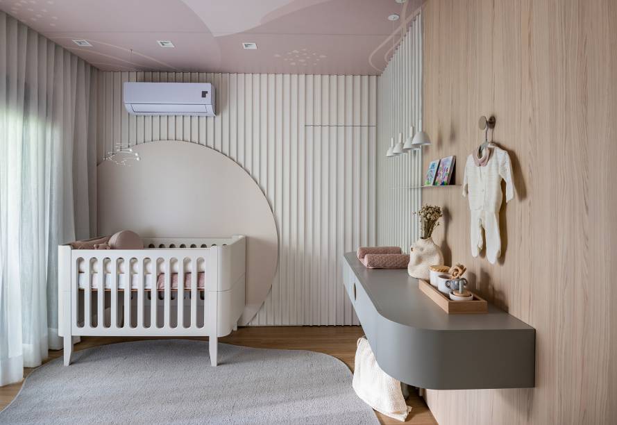 O quarto do bebê foi projetado com tons suaves, que ajudam a evitar superestimulação visual. A decoração simples e minimalista facilita o acesso a itens essenciais como fraldas e roupas.
