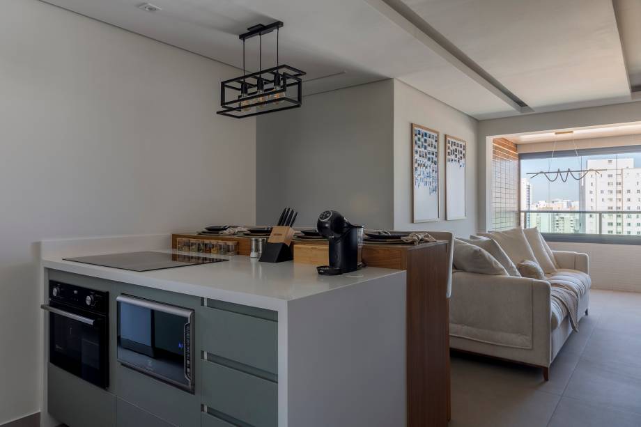 A decoração segue uma paleta em tons neutros, com destaque para o tom da marcenaria, que ganha todos os ambientes.