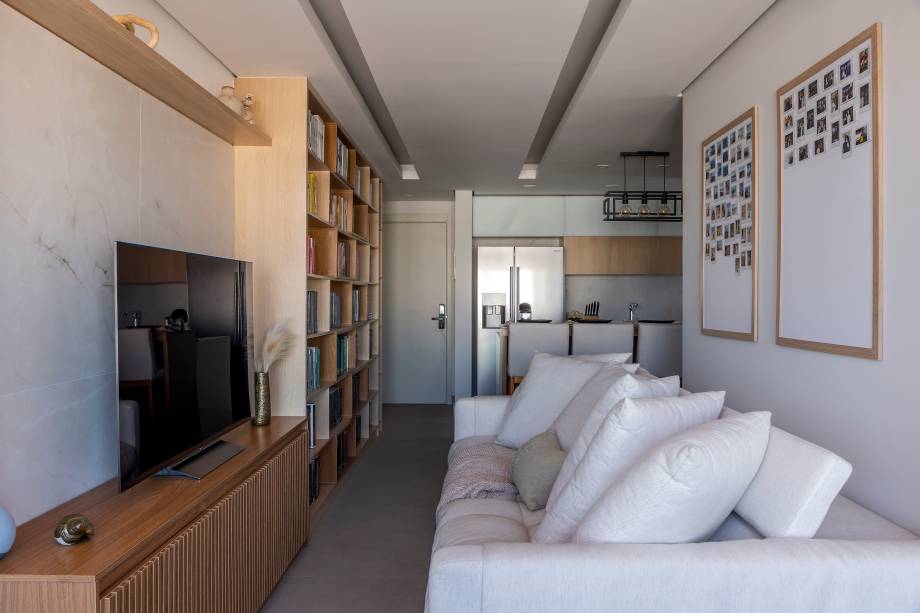 O living chama a atenção pela estante com os livros, organizados por cor, que, além de organizados dão toque descontraído ao apartamento.