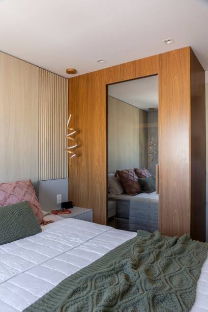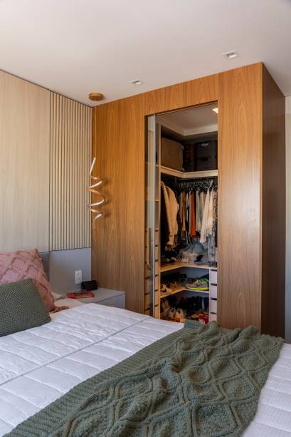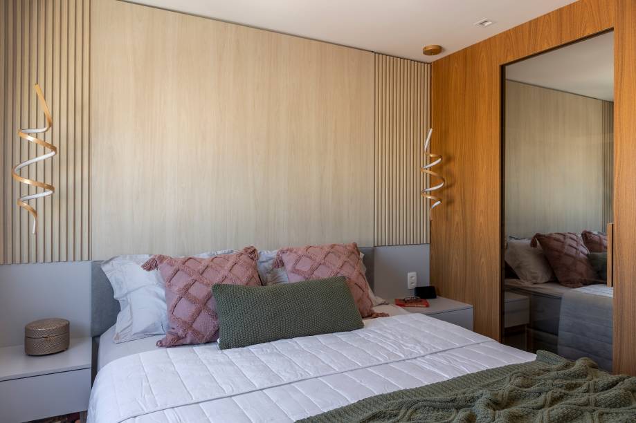 Ainda no quarto, a arquiteta encontrou um pilar onde ficaria a cabeceira da cama, a solução foi a criação de um painel que percorre toda a parede da cama. Ele possui um armário secreto dentro da estrutura ripada.