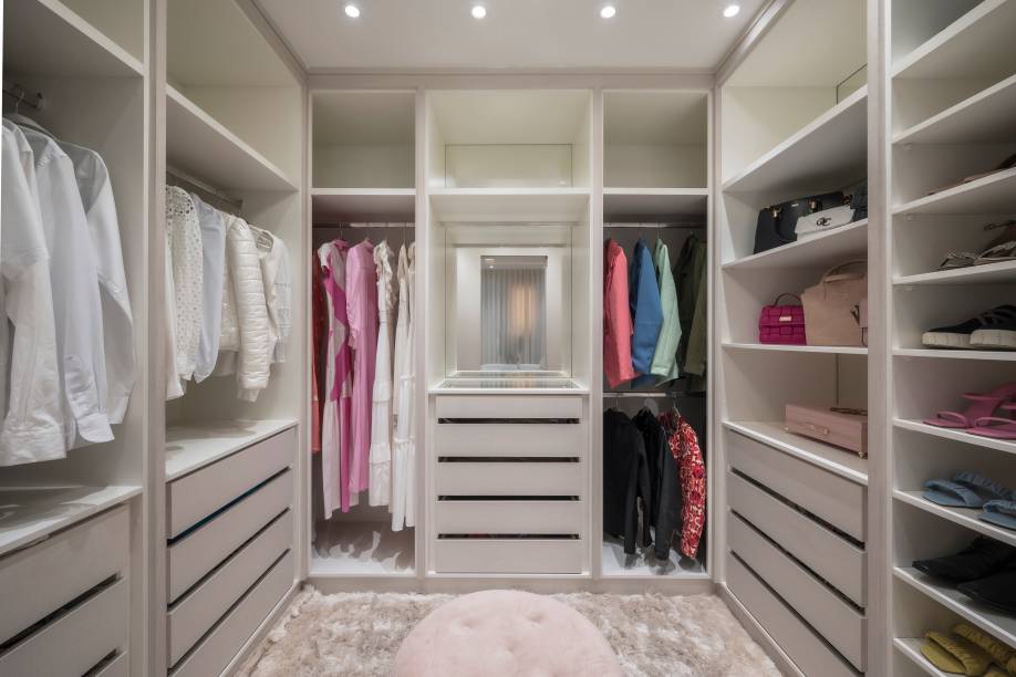 Desse modo, a divisão interna do móvel é personalizada e dispõe de nichos que deixam à mostra os itens pensados para ficar sempre à mão, como sapatos e bolsas. Sobre o piso, um delicioso tapete permite que os proprietários fiquem descalços enquanto escolhem os looks e, ao centro, o banco estofado oferece conforto extra.