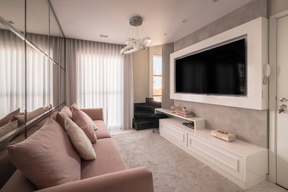 A sala de estar com TV é o espaço mais movimentado do apartamento. Isso porque o ambiente serve de acesso aos quartos e ao segundo piso do imóvel.