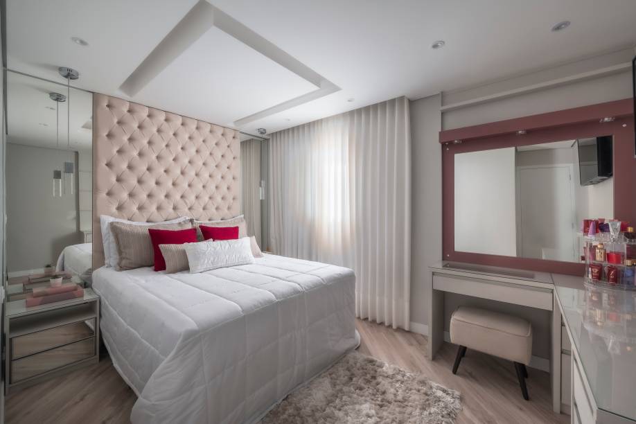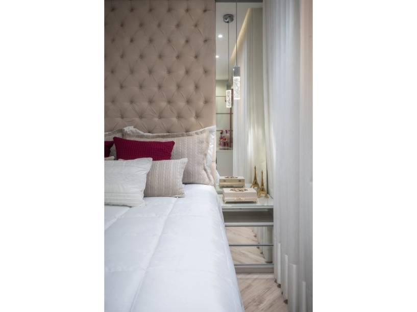 No quarto do casal, o clima de romance está no ar e a grande responsável por essa atmosfera é a cabeceira estofada com capitonê, instalada até o teto, recurso que alonga o pé-direito. Ao lado da peça, espelhos ampliam a claridade natural.