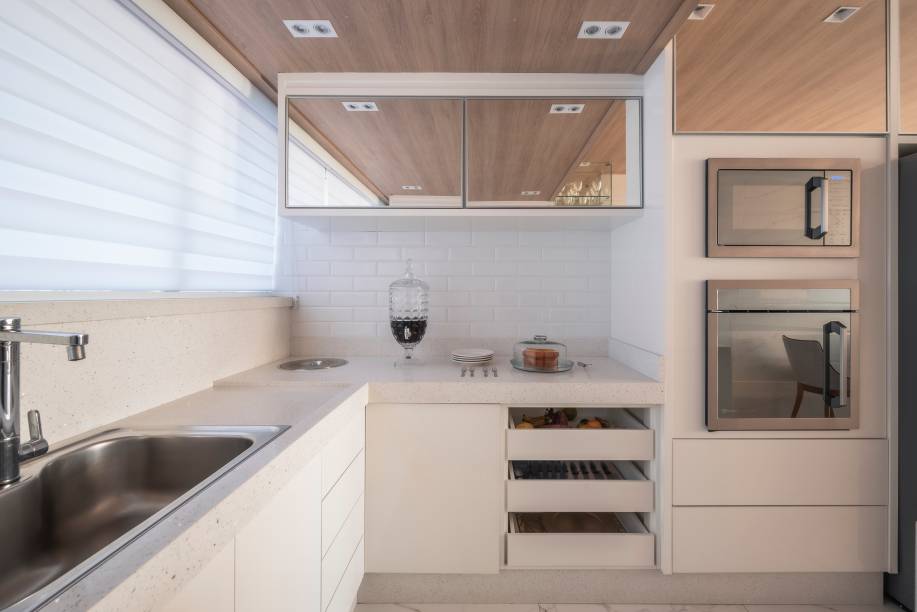 O predomínio do branco reforça a sofisticação na cozinha. Fácil de manter, a bancada de quartzo contorna o espaço: ela tanto acomoda o cooktop como envolve a cuba e dá origem às áreas de apoio livres.