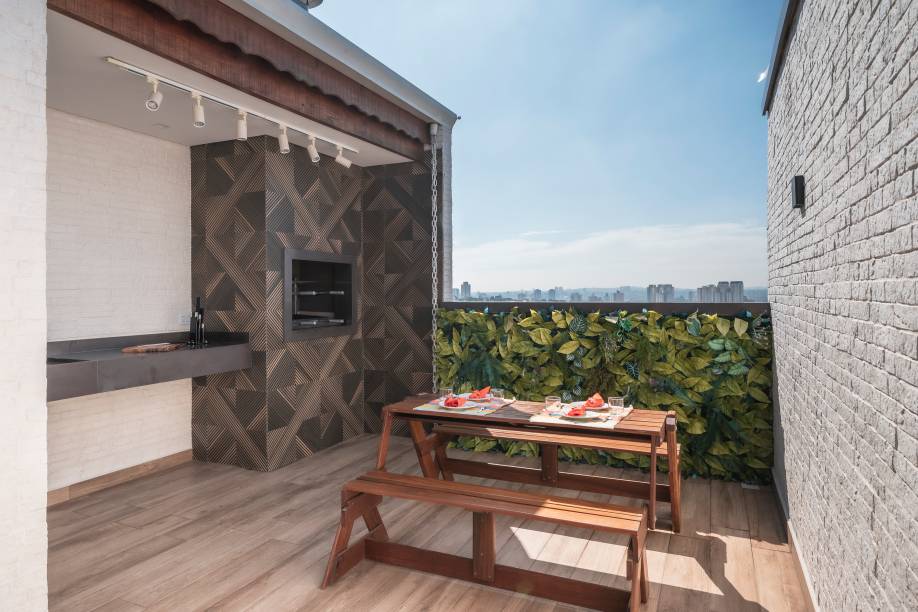 Versátil, a mesa de madeira tem bancos retráteis acoplados. Quando recolhida, a peça ocupa menos espaço. Ao fundo, a parede verde dá vida e frescor ao ambiente. “Ficou um lugar muito convidativo para os moradores tomarem sol e relaxarem no fim de semana”, finaliza o arquiteto.