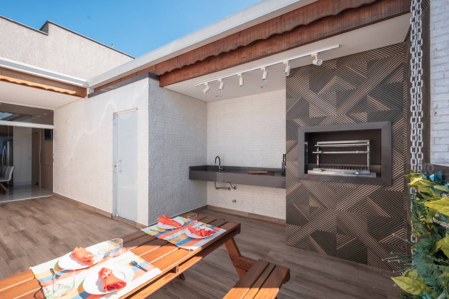 Do lado de fora do segundo pavimento, a área gourmet chama a atenção graças à mistura de materiais: porcelanato com aspecto de madeira no piso e, na churrasqueira, um revestimento de visual geométrico, que reproduz um trabalho de marchetaria.