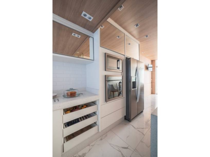 Uma ideia engenhosa garante leveza à marcenaria: os módulos aéreos do armário foram revestidos de espelho e, desse modo, praticamente desaparecem.