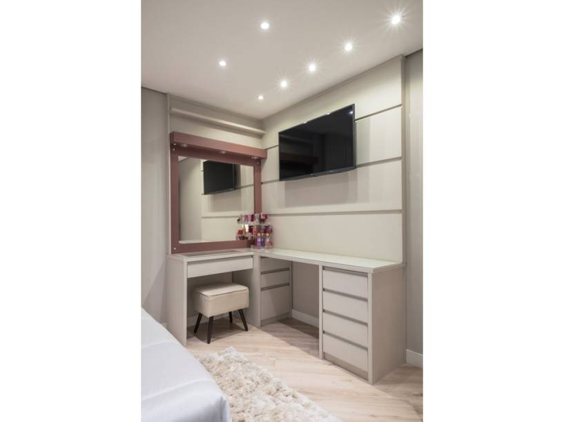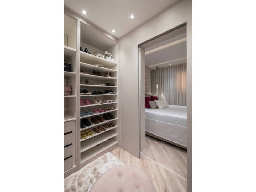 O closet do tipo walk in (ou seja, que ocupa todo o ambiente), feito para atender ao desejo da moradora, foi projetado para ser prático e inteligente. Uma análise da quantidade de peças de roupas e acessórios que o casal possui deu origem ao desenho da marcenaría.