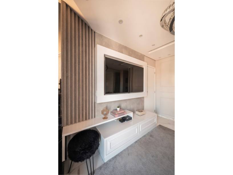 Na marcenaria, o rack tem um ar de boiserie clássica devido às molduras simétricas aplicadas ao móvel. Em contraponto, o ripado na lateral garante caráter moderno ao conjunto. Outro ponto alto do espaço está na iluminação: o lustre com anéis intercalados, com seu visual futurista, atrai todos os olhares.