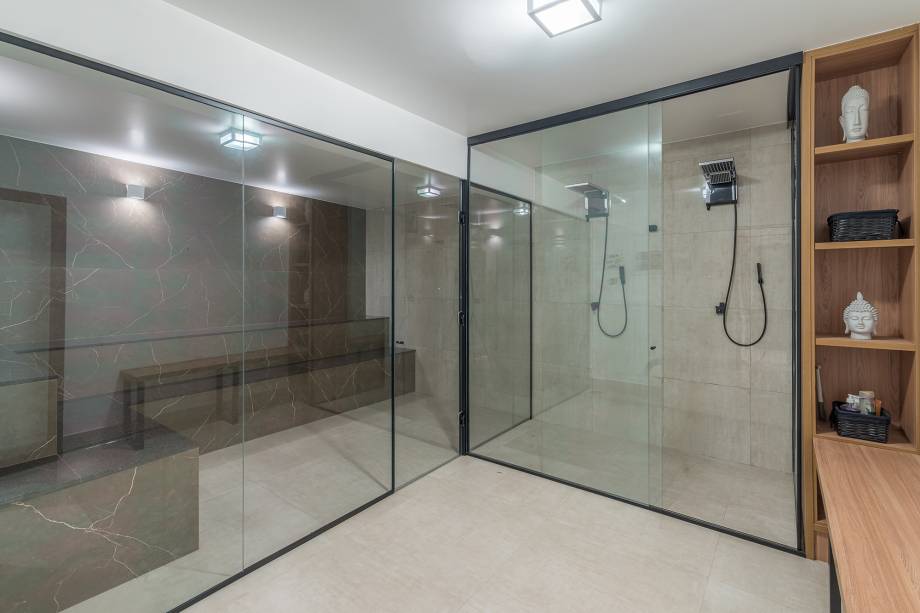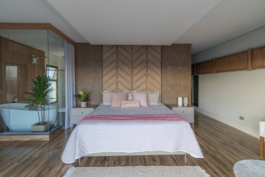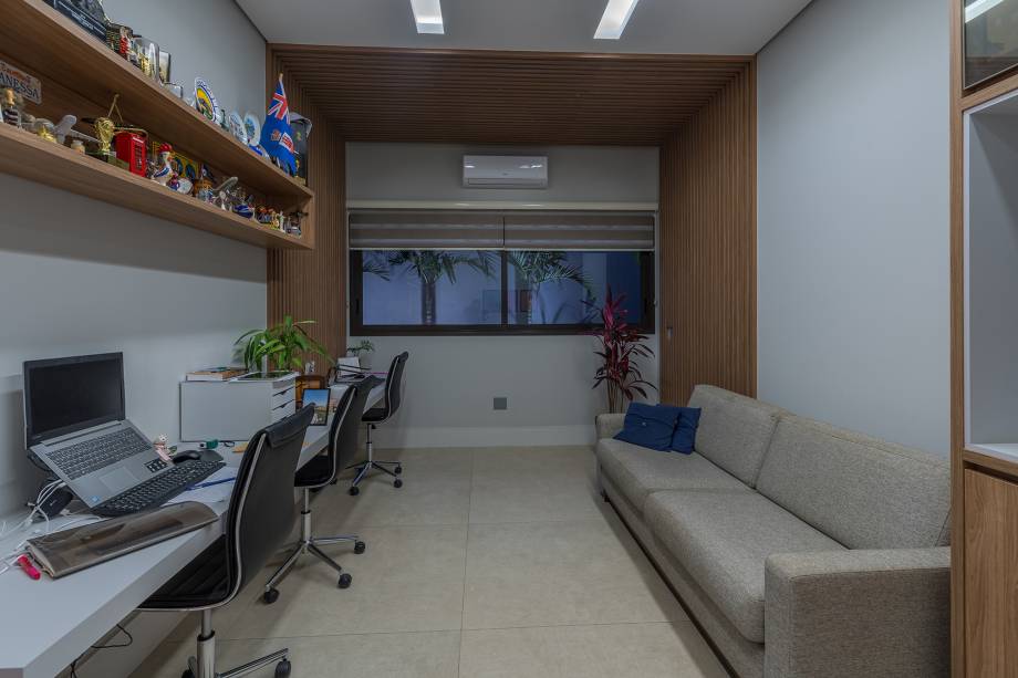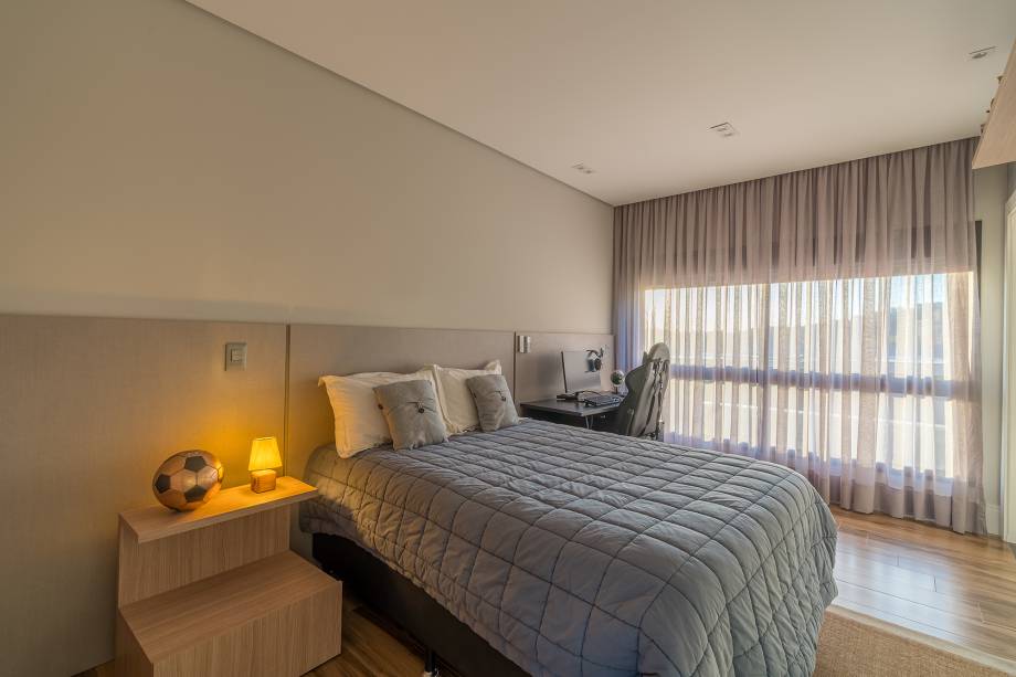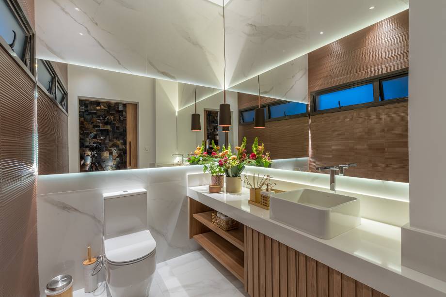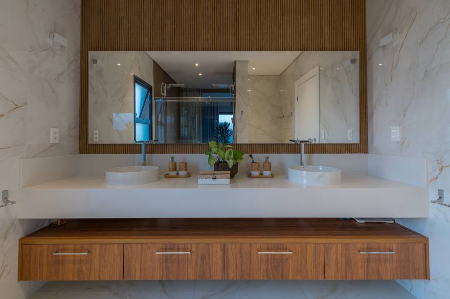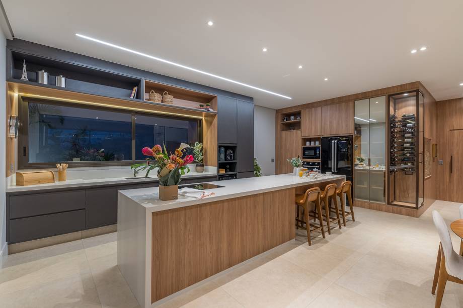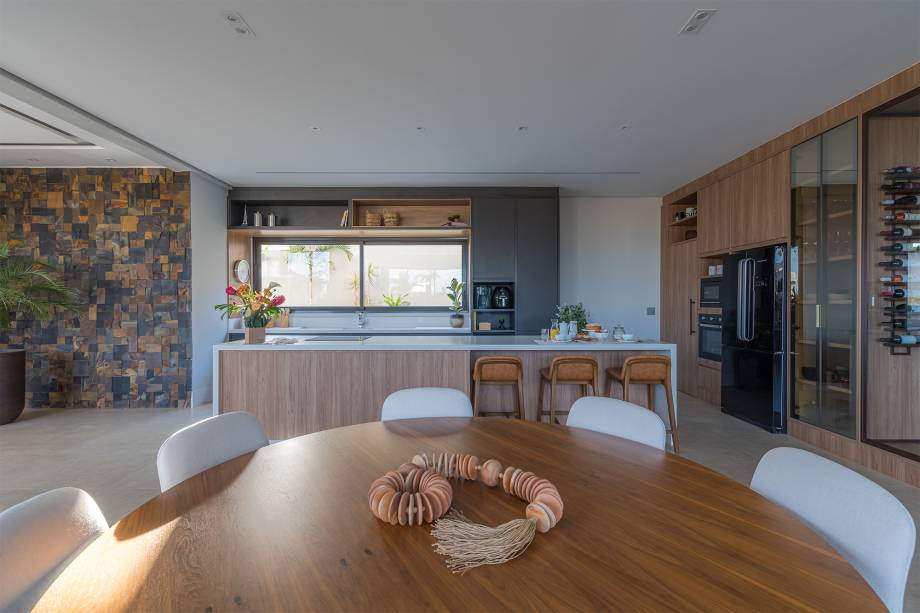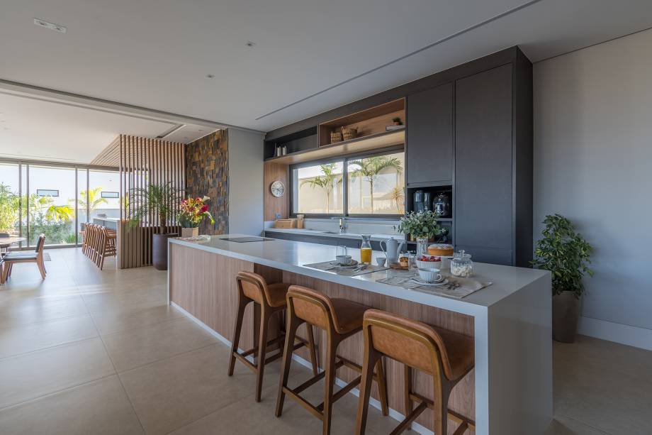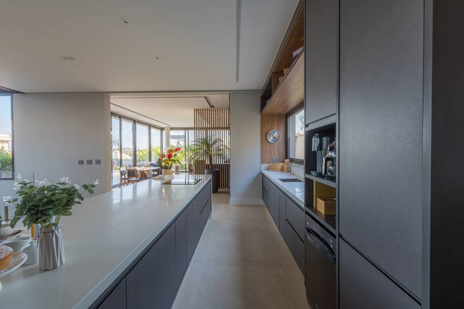 A cozinha, totalmente integrada às salas de jantar e living, é um convite à confraternização familiar, com destaque para o revestimento de madeira com detalhes ripados. O lavabo espaçoso foi pensado para receber cadeirantes e portadores de necessidades.