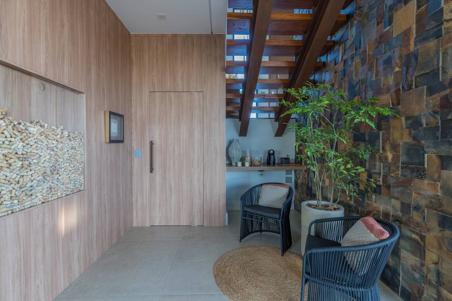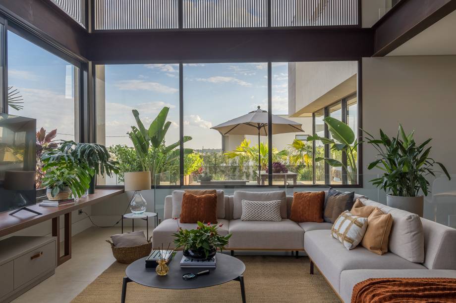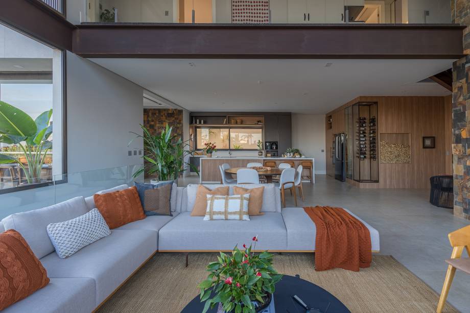 Por isso, nos interiores – que oscilam entre o industrial e o contemporâneo – os materiais naturais prevalecem: as pedras pau-ferro e a mineira se aliam à estrutura metálica pintada de corten. A decoração neutra segue a paleta de cores, promovendo uma sensação serena e acolhedora, ampliada pela luminosidade abundante que permeia todos os cômodos.