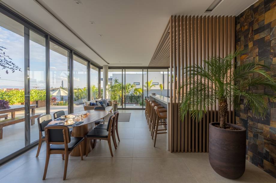Um dos grandes desafios enfrentados pela arquiteta foi gerar grandes aberturas para aproveitar as deslumbrantes vistas de paisagens naturais do condomínio, sem comprometer a privacidade e a integridade da residência.