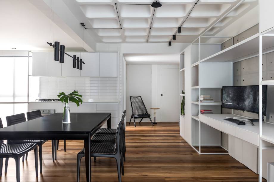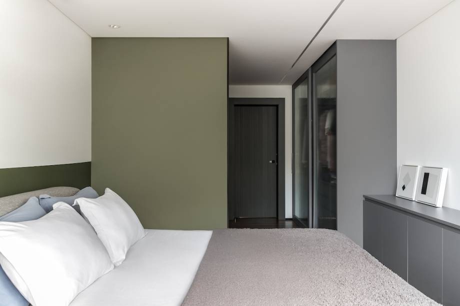 A atmosfera bastante sofisticada possui um estilo bastante urbano, com linhas retas e poucos adereços. A paleta de cores é tranquila, em tons de verde, madeira e toques de preto. Com a luz natural invadindo o apartamento, é o contraste entre claro e escuro que separa soluções sofisticadas e irreverentes, acomodando o olhar onde encontra equilíbrio.