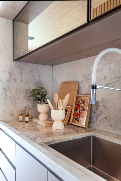 No décor de interiores, espelhos são sinônimos de amplitude! Assim, o elemento se faz presente no estúdio por meio da marcenaria em que a arquiteta uniu o guarda-roupas, TV e um pequeno home bar. A mesma estratégia foi adotada nos armários da cozinha, entregando a percepção de uma área maior – além do charme.
