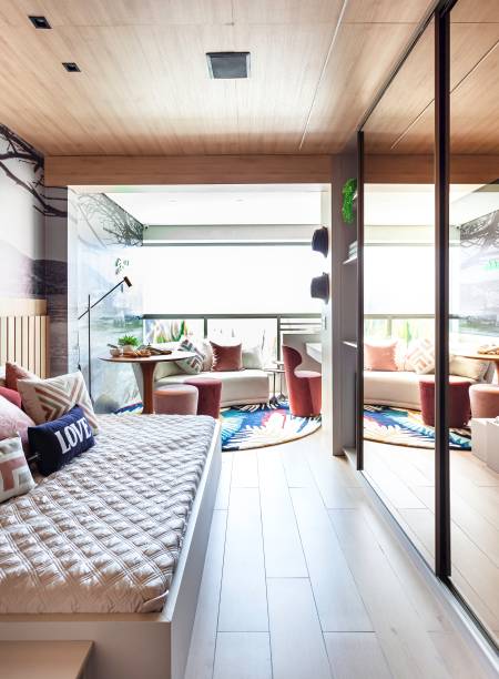 Eleito como um dos ambientes mais queridinhos, o dormitório é conectado à varanda, com direito a uma pequena área de jantar e um sofá curvo, que recepciona os convidados. Neste espaço, chama a atenção também o Viva Magenta, eleita a cor do ano de 2023 pela Pantone, que marca presença nos móveis em móveis soltos.
