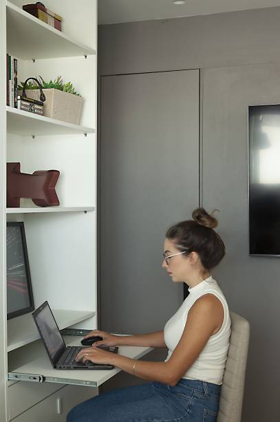 Engana-se quem pensa que apartamentos pequenos podem dispor de uma ambientação pensada para o home office. Mas como incluir, sem ocupar um fixo no projeto? A estante multifuncional oferece uma base que se transforma em mesa: ao terminar as atividades, é só fechar e usufruir, novamente, da plenitude idealizada para a sala de estar.