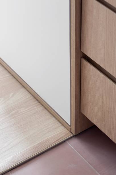 Para o décor, foram escolhidos tons claros e materiais de fácil manutenção. A utilização do carvalho malva na marcenaria combinada com branco e tons mais creme nas paredes deixaram o apartamento mais claro e amplo, atendendo às solicitações do morador. Além disso, a brincadeira com inversão de cores auxilia também na definição dos espaços.