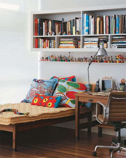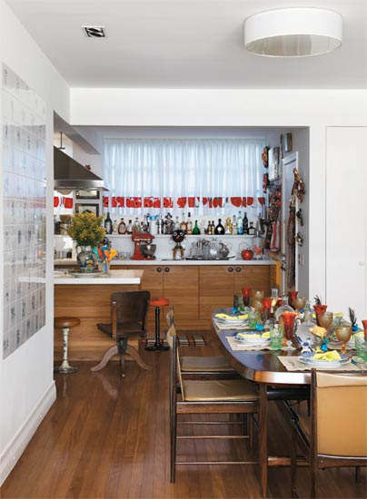 Debruçado sobre a lagoa Rodrigo de Freitas, o apartamento de 300 m² parece bordado a mão por sua proprietária, Isabela Capeto, estilista carioca que trouxe o artesanato para a moda e estende essa tendência à decoração de sua casa. Por todos os cantos, há o que admirar: toy art, imagens sagradas e porcelanas raras se misturam a estampas e flores. Desde pequena, Isabela gosta de juntar coisas. Essa característica pode ser apreciada nos nichos da estante que atravessa a sala do apartamento, repleta de bichinhos, flores de madeira, bonecas, robôs, imagens de santos, porcelanas e toy art em grupos temáticos. Adoro coleções e quero que todos possam vê-las, diz. A reforma foi planejada pelos arquitetos Beto Figueiredo e Luis Eduardo Almeida, da Ouriço Arquitetura, e teve como objetivo distribuir melhor os espaços para que a família Capeto pudesse compartilhar seus preciosos tesouros com os amigos. O arquiteto e designer Paulo Alves também fez uma reforma sob medida: ele transformou um galpão antigo numa casa rústica.