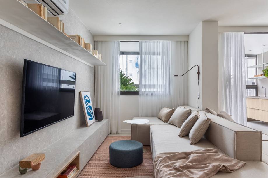 Já os materiais foram selecionados para acrescentar várias camadas sutis de texturas e cores ao décor, sem pesar visualmente, a exemplo do painel amadeirado em tonalidade clara que reveste a parede principal da sala – replicado nos armários da varanda gourmet, da cozinha e no aparador -, o piso de porcelanato cinza claro no padrão cimento queimado e os tecidos de linho e algodão.