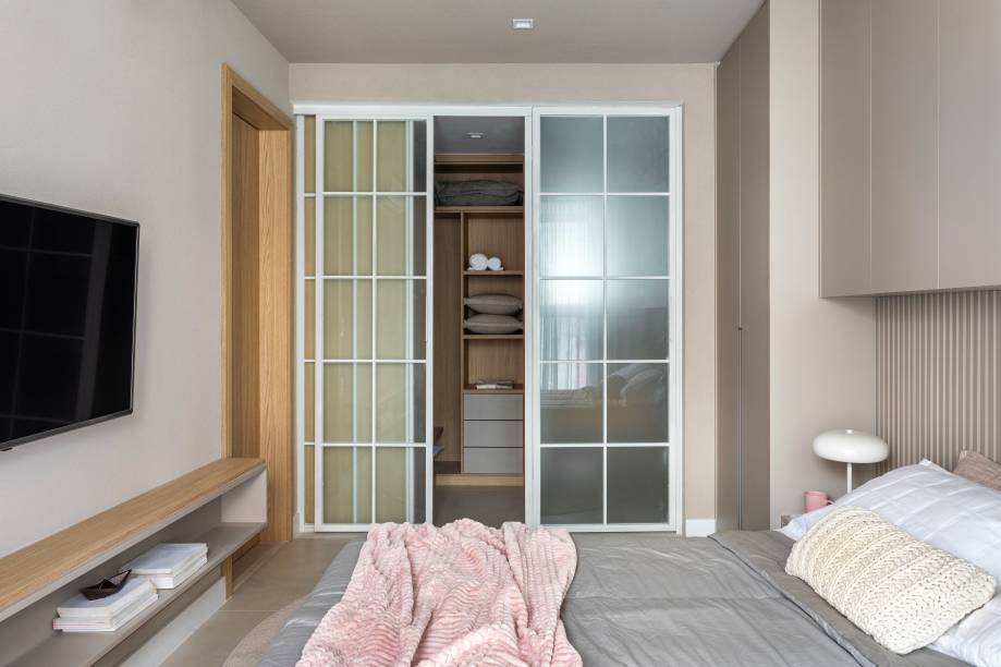 Com a reforma, a sala e a cozinha – antes, separadas – foram integradas. No quarto do casal, a parede que separava o banheiro do dormitório foi eliminada e o espaço foi redimensionado para abrigar um closet que não existia na planta e gerar novas áreas de armazenamento.