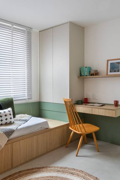 “Os clientes pediram soluções para potencializar a sensação de amplitude do apartamento, um espaço confortável para receber os amigos, uma cozinha prática, funcional e farta em luz natural, um quarto amplo e bem servido de armários para eles e um quarto confortável para o filho adolescente”, conta Michelle.