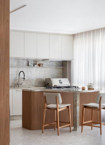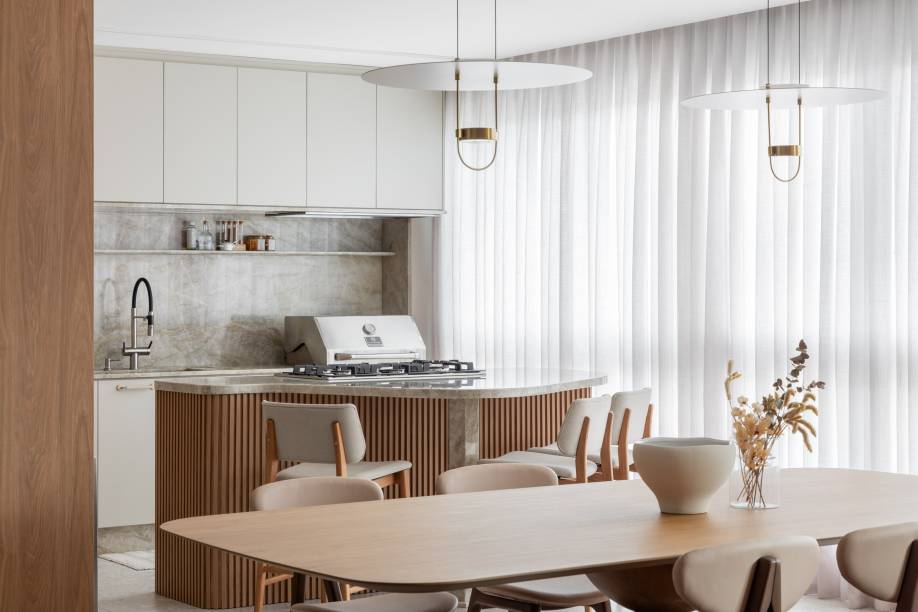 A cozinha foi realocada próxima ao janelão principal, integrando-se à churrasqueira a gás e privilegiando a ilha central de formato orgânico. A bancada, os nichos e a roda-banca em Mármore Taj Mahal reforçam a sofisticação e fluidez do cômodo.