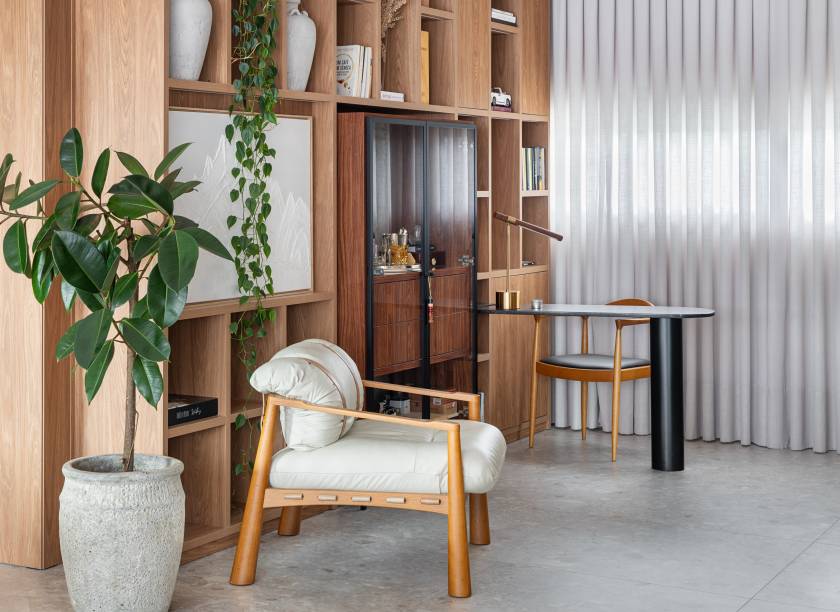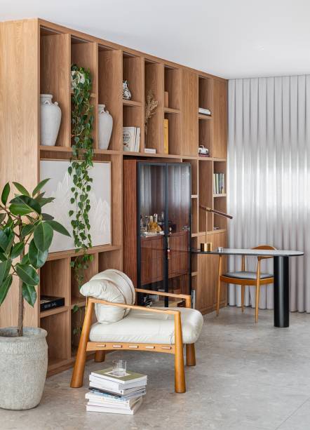 O home office foi reposicionado ao lado da sala de TV, onde originalmente ficava a cozinha, otimizando a ventilação cruzada e conferindo maior profundidade ao local. No centro da estante, um móvel solto, desenhado pelo escritório, acomoda vinhos, charutos e bebidas quentes.
