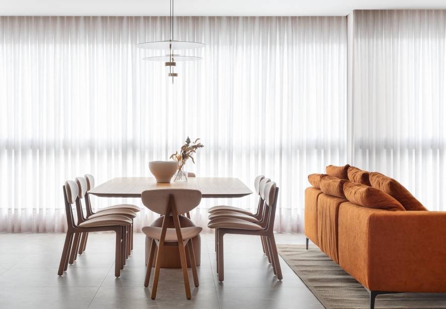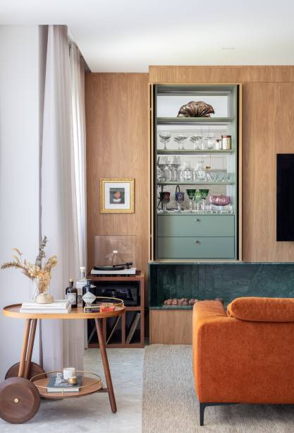 Na sala de TV, um painel de madeira abriga uma cristaleira embutida com porta mimetizada, que funciona como apoio em dias de festa. A paleta neutra do ambiente ganha contraste com um sofá terracota e a lareira em mármore Verde Guatemala.