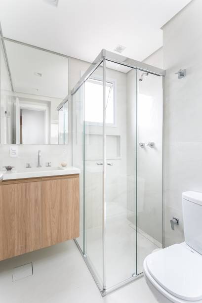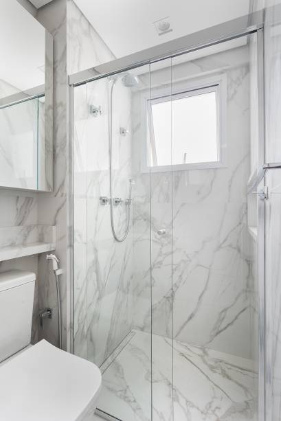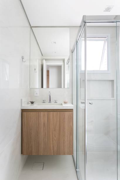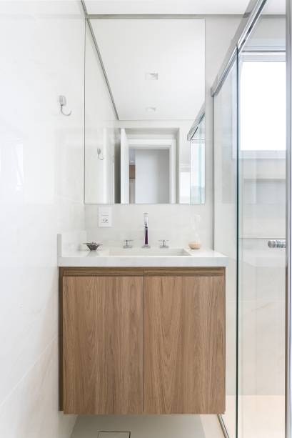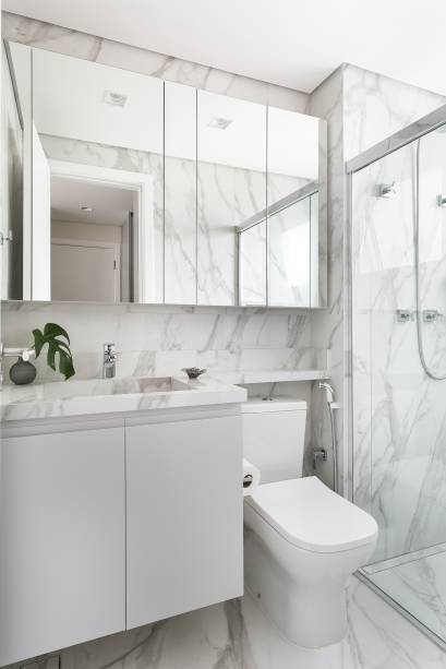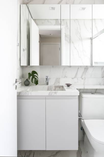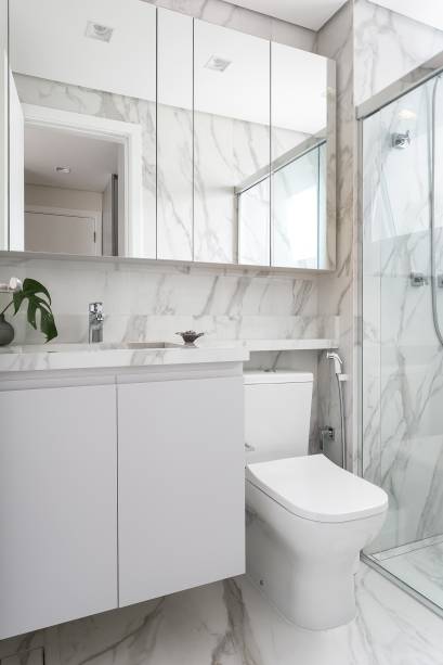 Para o banheiro da suíte, foi utilizado um revestimento marmorizado branco com veios acinzentados. O espelho reveste armários aéreos, podendo funcionar como espaço de armazenamento funcional mas sem perder a beleza.